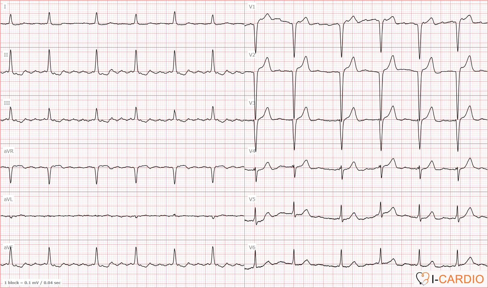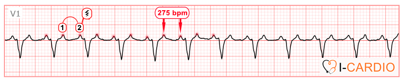 This ECG clearly demonstrates regular atrial activity with a rate of approximately 275 bpm, consistent with atrial flutter. Only every second impulse is conducted to the ventricles, corresponding to a 2:1 AV conduction ratio.