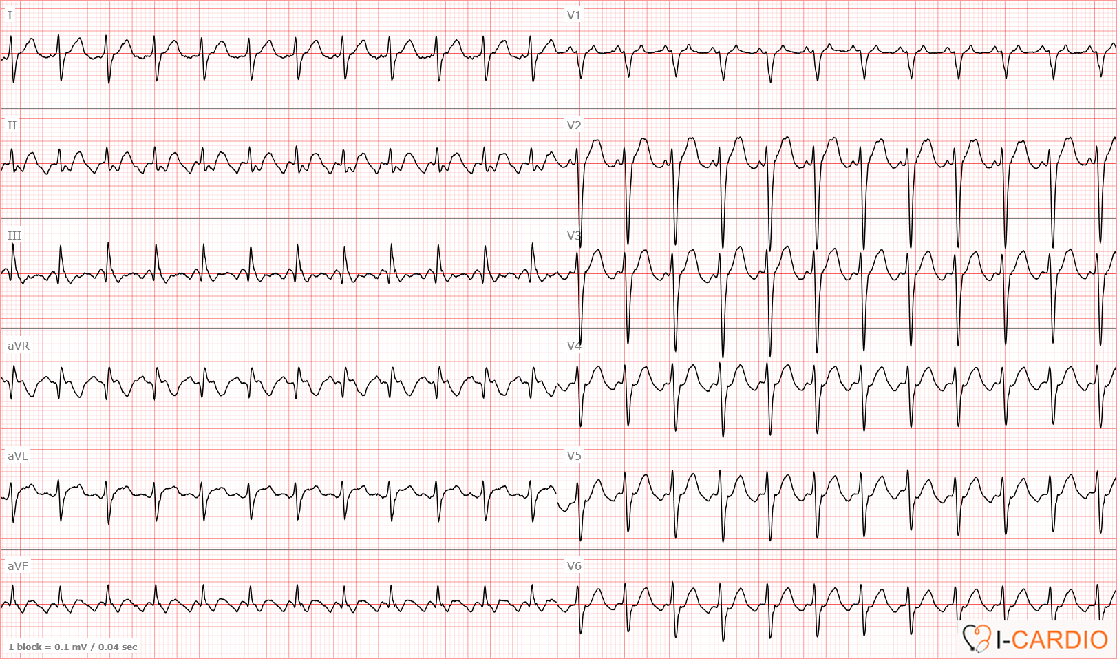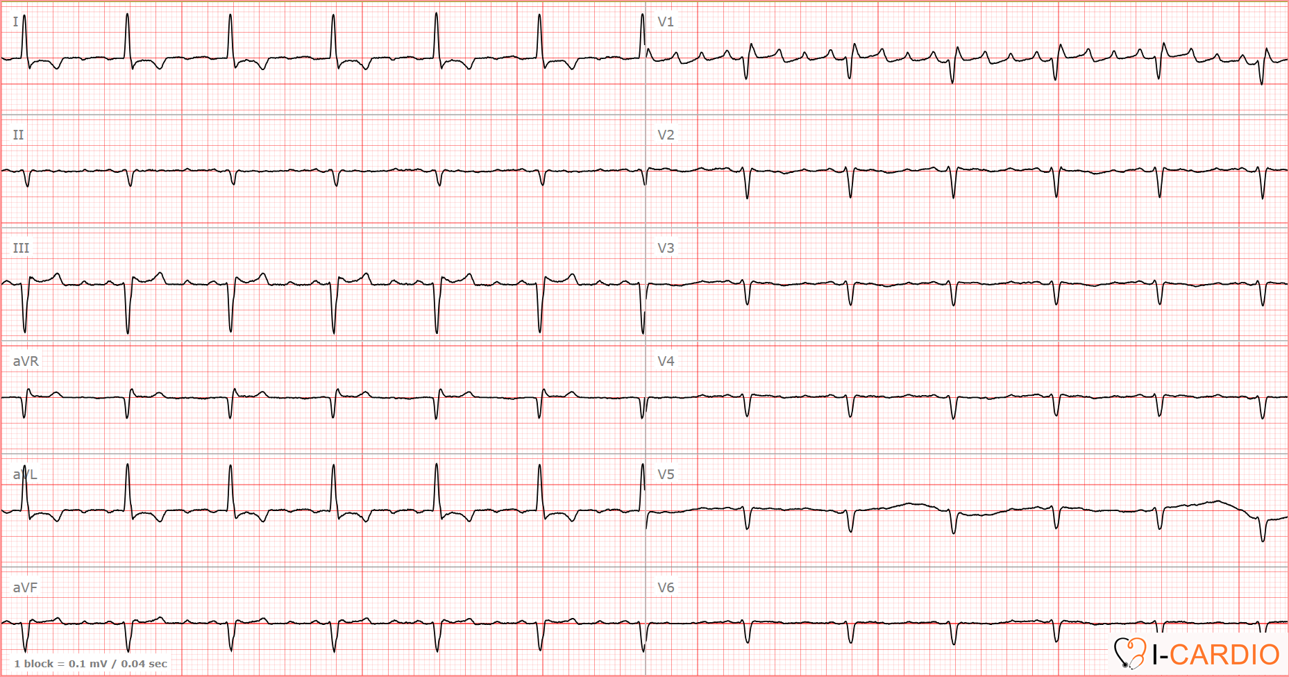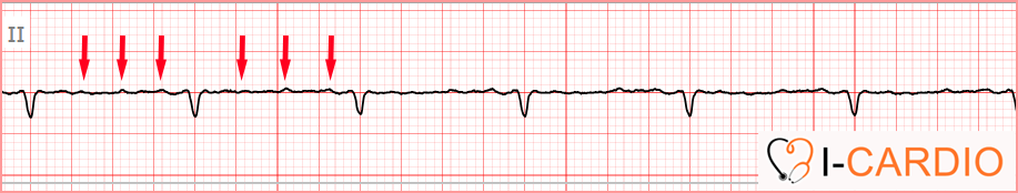 This ECG demonstrates a regular ventricular rate of approximately 75 bpm; however, attempts to identify P waves in lead II are unsuccessful.