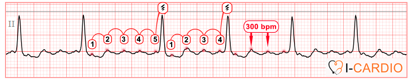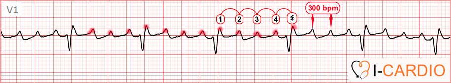 At the same time, the atrial rate (not to be confused with the ventricular rate) typically ranges from 250 to 400 beats per minute. This corresponds to an F–F interval of approximately 150–300 ms, or, in practical terms, 3.75–7.5 mm at a paper speed of 25 mm/s.