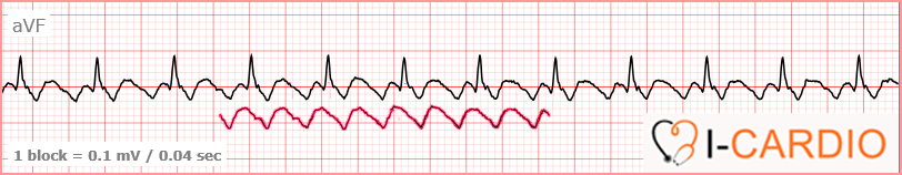You may ask: where is the classic “sawtooth” pattern? First, it is not always present. Second, it requires careful inspection — and a certain degree of “clinical imagination” — to recognize it. Now look at lead aVF on the same ECG. I have shifted the F wave downward for better visualization.